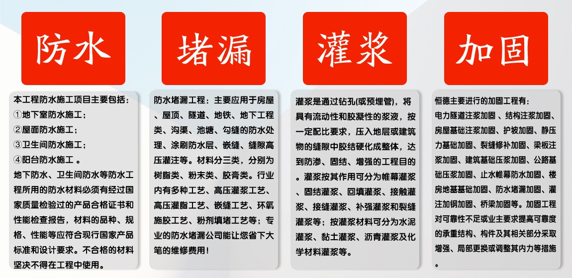 恒德專注全國地區(qū)注漿、防水、堵漏、加固工程,公司實力認證,質(zhì)量可靠,值得信賴!