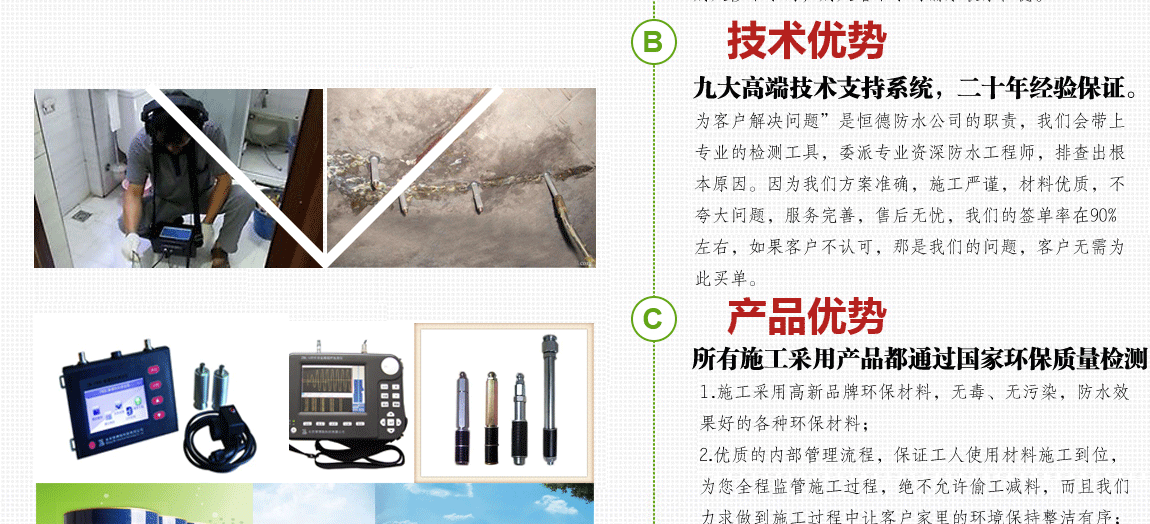 4:廚衛(wèi)漏水非水管原因不敲瓷磚,因為傳統(tǒng)的防水一漏就建議敲,卻始終沒有解決根本問題,有些客戶新裝修才半 個月墻角就漏,有些幾年后才漏,這種情況排除水管漏水原因后,采用進口材料是確保根治漏水的關(guān)鍵。因為花差不 多的價格,用的進口材料(實際上我們這種材料成本高于國產(chǎn)的40倍 根據(jù)多種優(yōu)質(zhì)材料特性添加 強強調(diào)合 確保防水 無憂 ),工期縮短,無噪音,無污染,一次修復壽命更長,盡量做到修復之后不破壞原裝修或微創(chuàng)處理,