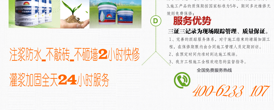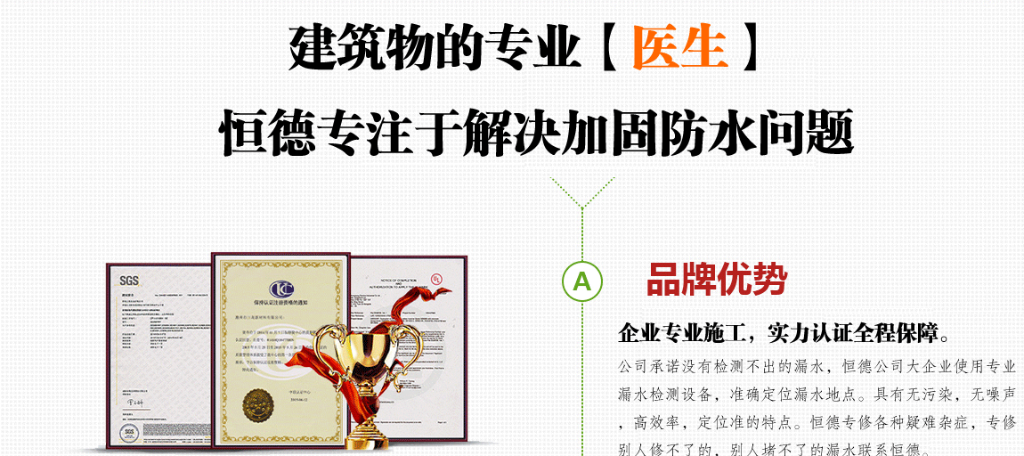 3:防水材料不僅僅要求“合格”,更要質(zhì)優(yōu),我們采用的進口材料曾用于海洋水族館大型防水工程,大型廢水池,地鐵 涵洞等工程,它的環(huán)保程度和抗酸堿要求非常的高,曾多次獲得各種證書,有質(zhì)檢報告,工作人員隨身攜帶復印件可 供客戶驗證參考。用于家庭漏水,更是輕松解決。